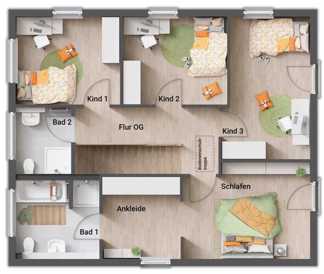 Auch das Obergeschoss zeigt sich im gradlinigen Baustil des Hauses. Hier finden Sie drei Zimmer, die Sie nach Ihren Vorstellungen als Schlaf-, Kinder- oder Gästezimmer nutzen können. Große Fenster lassen auch hier viel Tageslicht hineinströmen. Die Ankleide im Schlafzimmer bietet viel Stauraum.